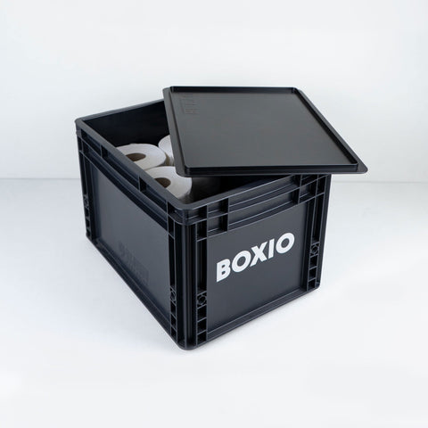 Eurobox with lid made with recycled plastic in Germany by the German quality leader. With its subtle black color, this plastic box stands out beautifully from the usual grey.